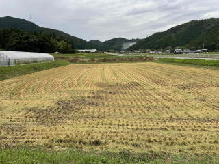 右の田んぼは、前作が黒大豆にため牛糞堆肥を散布しています。